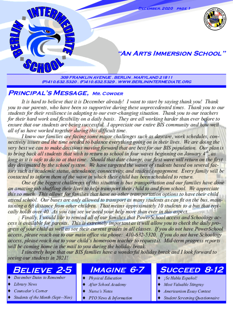 December. 2020 page 1An Arts Immersion School309 FRANKLIN AVENUE. BERLIN. MARYLAND 21811 (P)410.632.5320. (F)410.632.5329. WWW.BERLININTERMEDIATE. Principals Message, Mr. Concert is hard to believe