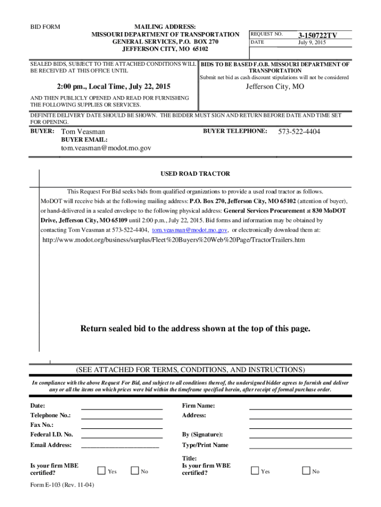 BID FORMATTING ADDRESS: MISSOURI DEPARTMENT OF TRANSPORTATION GENERAL SERVICES, P.O. BOX 270 JEFFERSON CITY, MO 65102REQUEST NO.3150722TVDATEJuly 9, 2015SEALED BIDS, SUBJECT TO THE ATTACHED CONDITIONS