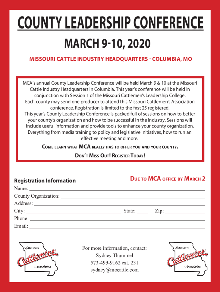 COUNTY LEADERSHIP CONFERENCE MARCH 910, 2020 MISSOURI CATTLE INDUSTRY HEADQUARTERS COLUMBIA, Mocks annual County Leadership Conference will be held March 9 & 10 at the Missouri Cattle Industry Headquarters