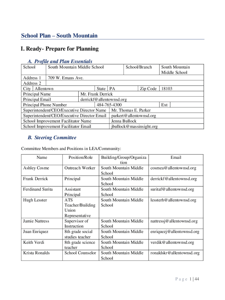 School Plan South Mountain I. Ready Prepare for Planning A. Profile and Plan Essentials School South Mountain Middle SchoolSchool/Branch South Mountain Middle SchoolAddress 1 709 W. Emacs Ave. Address
