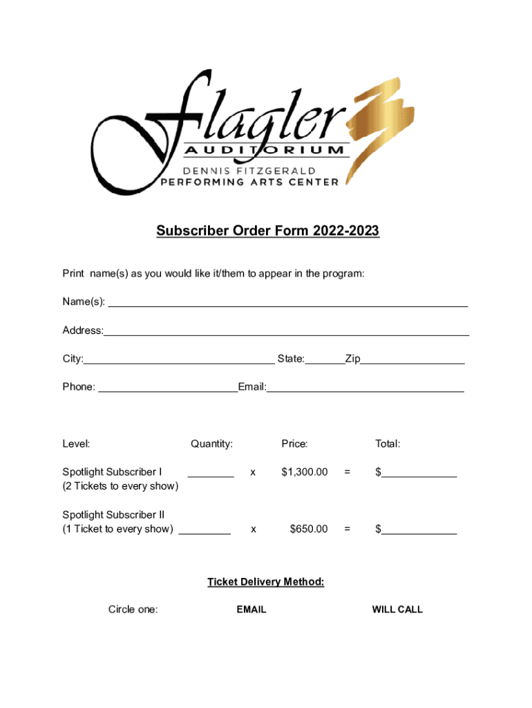 Subscriber Order Form 20222023 Print name(s) as you would like it/them to appear in the program: Name(s): ___ Address:___ City:___ State:___Zip___ Phone: ___Email:___Level:Quantity:Spotlight Subscriber