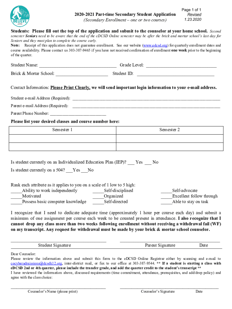 20202021 Part time Secondary Student Application (Secondary Enrollment one or two courses) Students: Please fill out the top of the application and submit to the counselor at your home school. Second