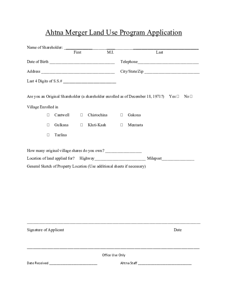 Aetna Merger Land Use Program Application Name of Shareholder: ___ First M.I. Last Date of Birth ___Telephone___Address ___City/State/Zip ___Last 4 Digits of S.S.# ___Are you an Original Shareholder