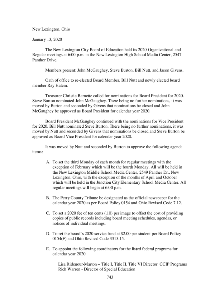 New Lexington, Ohio January 13, 2020, The New Lexington City Board of Education held its 2020 Organizational and Regular meetings at 6:00 p.m. in the New Lexington High School Media Center, 2547 Panther