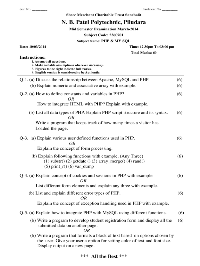 Seat No: ___Enrollment No: ___Three Merchant Charitable Trust Sakhalin. B. Patel Polytechnic, Pillar Mid-Semester Examination March2014 Subject Code: 2360701 Subject Name: PHP & MY SQL Date: 10/03/2014Time: