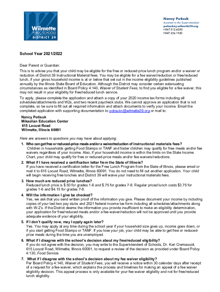 Nancy Polish Assistant to the Superintendent potisukn@wilmette39.org t 847.512.6030 f 847.256.1920School Year 2021/2022 Dear Parent or Guardian: This is to advise you that your child may be eligible