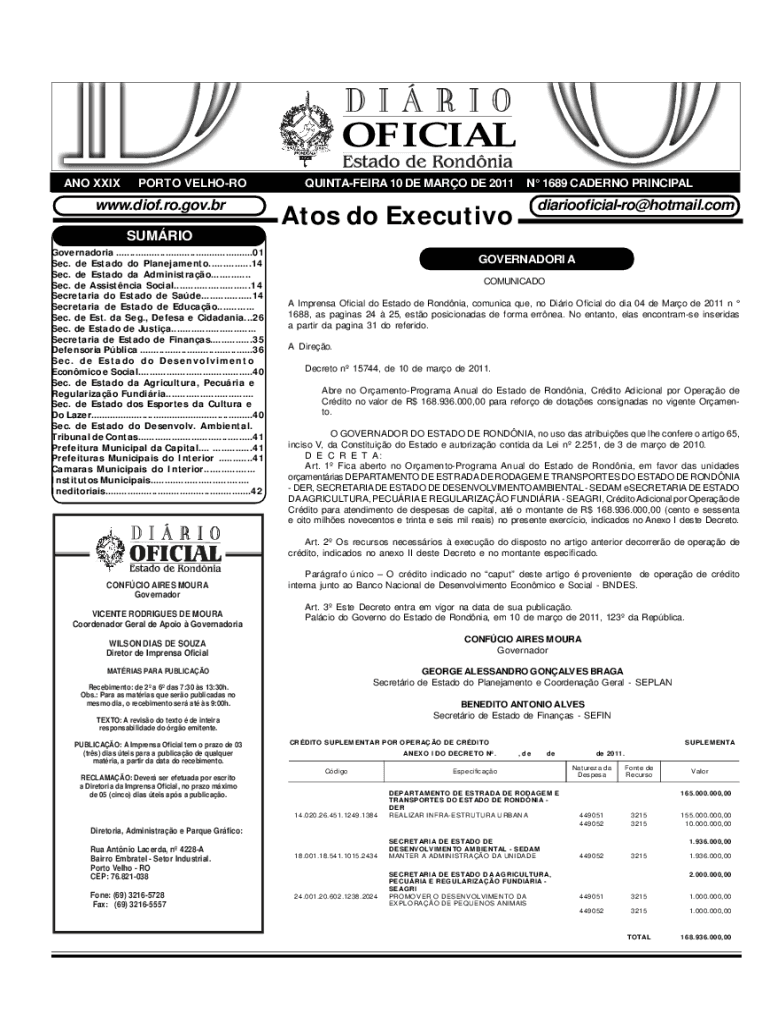 OFFICIAL ANO XXIXPORTO VELHOROwww. Dion.RO.gov.brQUINTAFEIRA 10 DE MAR ODE 2011 N 1689 SALERNO PRINCIPALdiariooficialro@hotmail.comAtos do ExecutivoSUMRIO SUMRIOGovernadoria ..................................................01
