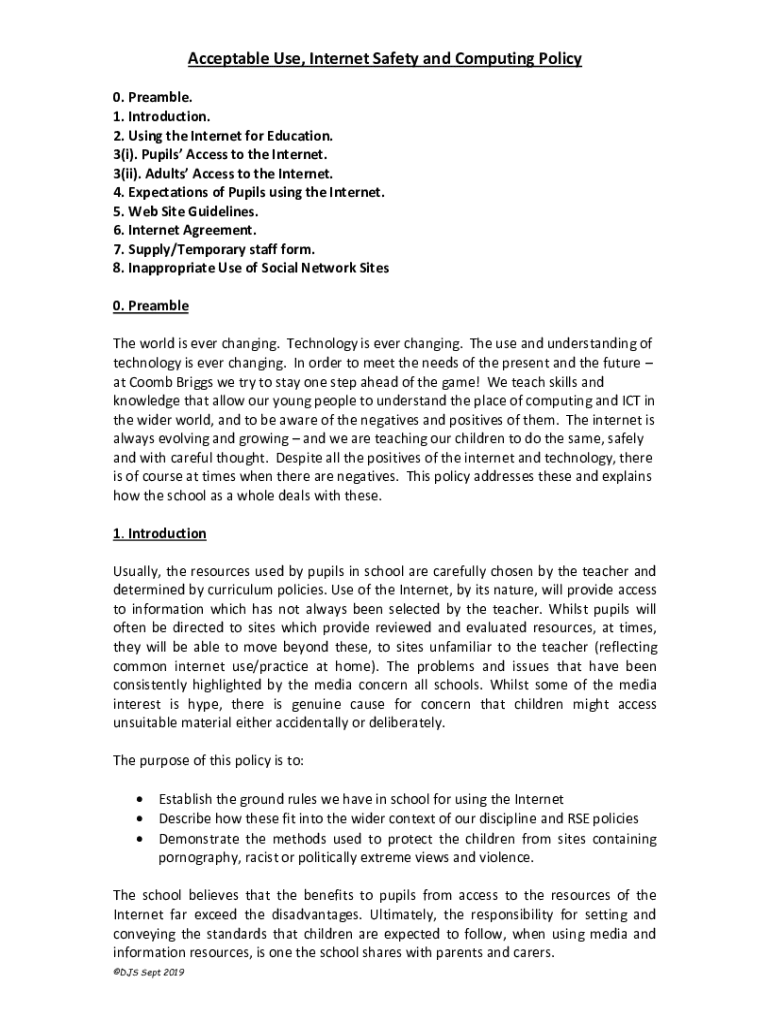 Acceptable Use, Internet Safety and Computing Policy 0. Preamble. 1. Introduction. 2. Using the Internet for Education. 3(i). Pupils Access to the Internet. 3(ii). Adults Access to the Internet. 4.