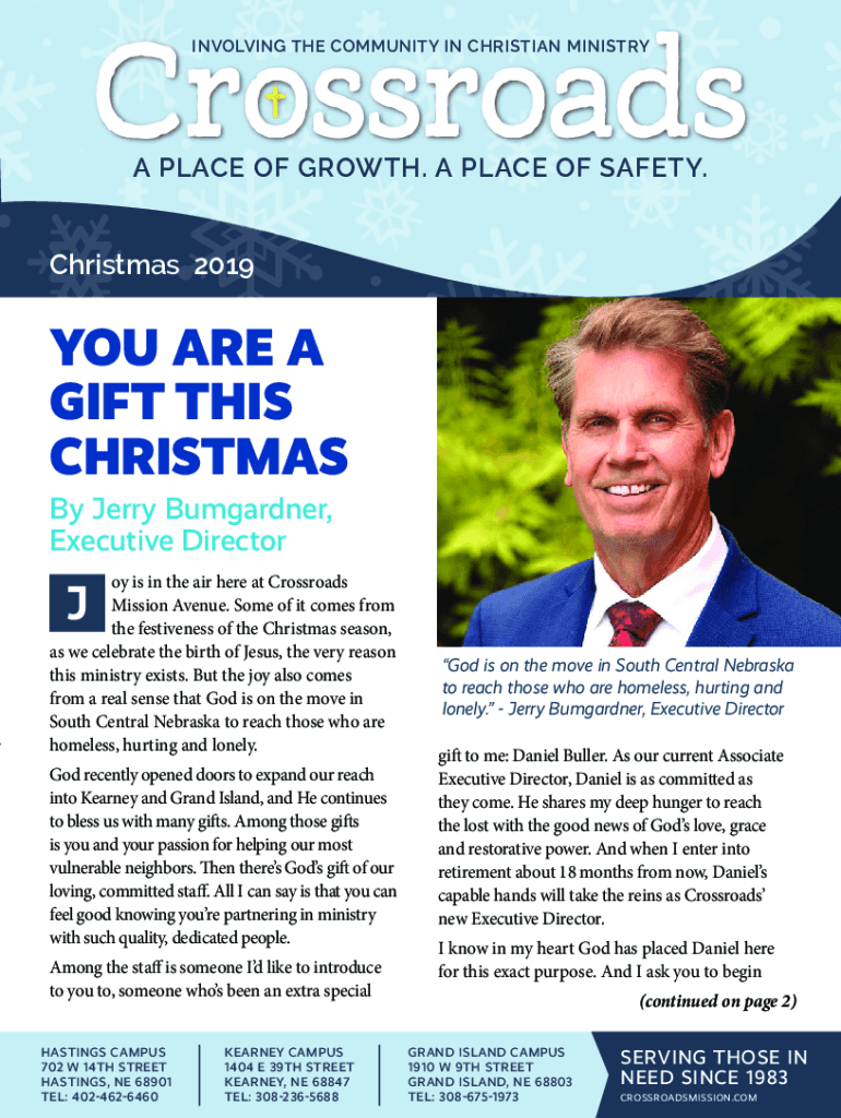 Crossroads INVOLVING THE COMMUNITY IN CHRISTIAN MINISTRY PLACE OF GROWTH. A PLACE OF SAFETY. Christmas 2019YOU ARE A GIFT THIS CHRISTMAS By Jerry Baumgartner, Executive Director of is in the air here
