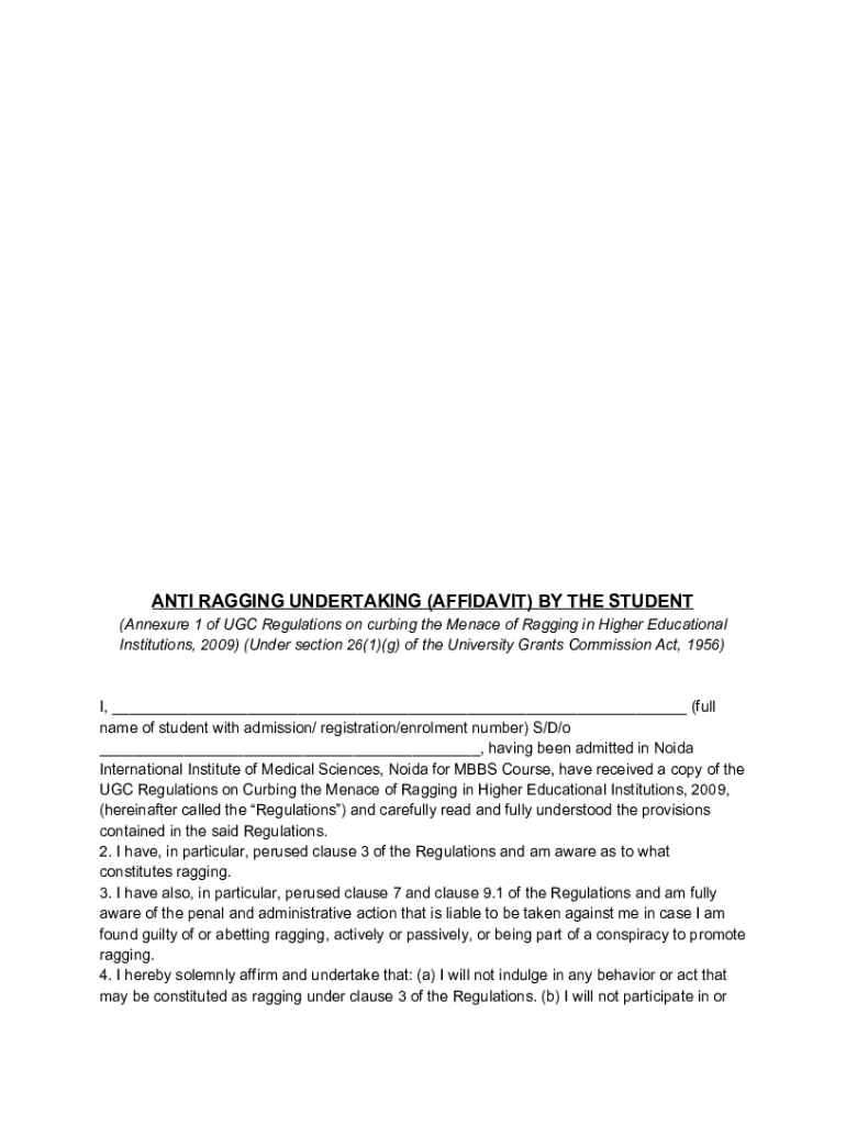 ANTI RAGGING UNDERTAKING (AFFIDAVIT) BY THE STUDENT (Appendix 1 of UGC Regulations on curbing the Menace of Ragging in Higher Educational Institutions, 2009) (Under section 26(1)(g) of the University