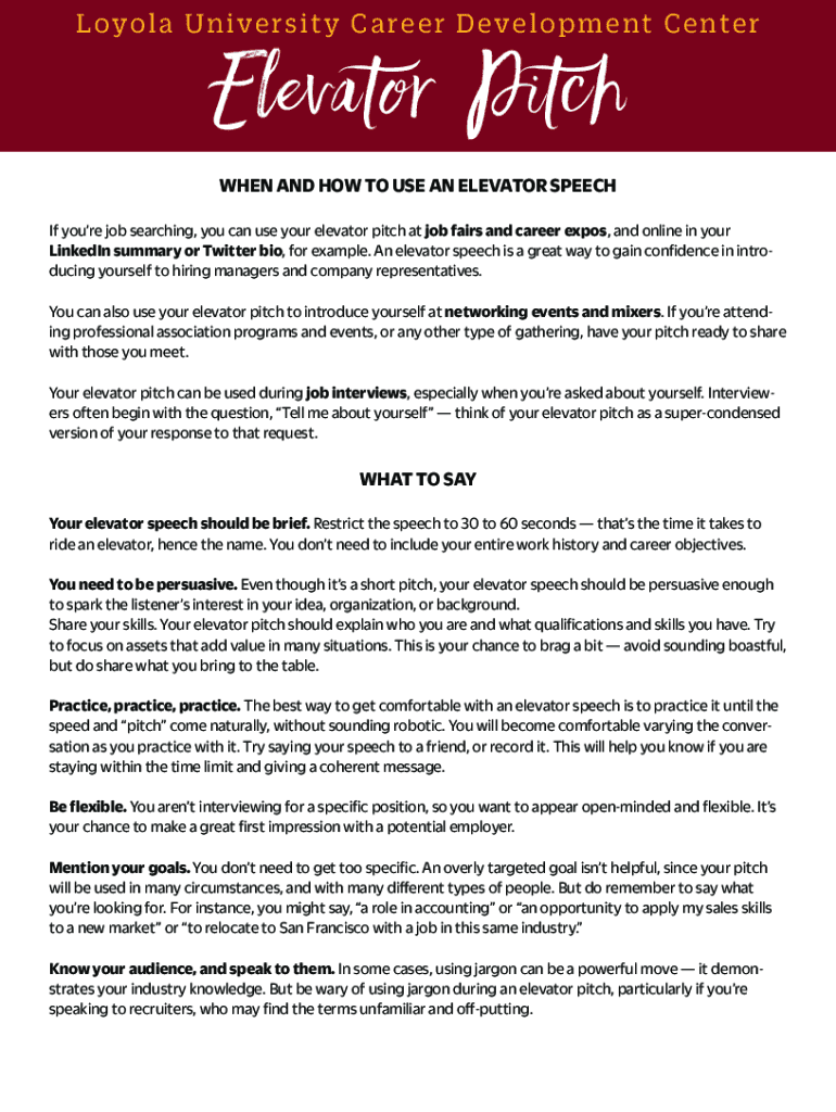 L yo la University C are e r D eve lo p me NT C e note elevator Pitch WHEN AND HOW TO USE AN ELEVATOR Speechify your job searching, you can use your elevator pitch at job fairs and career expos, and