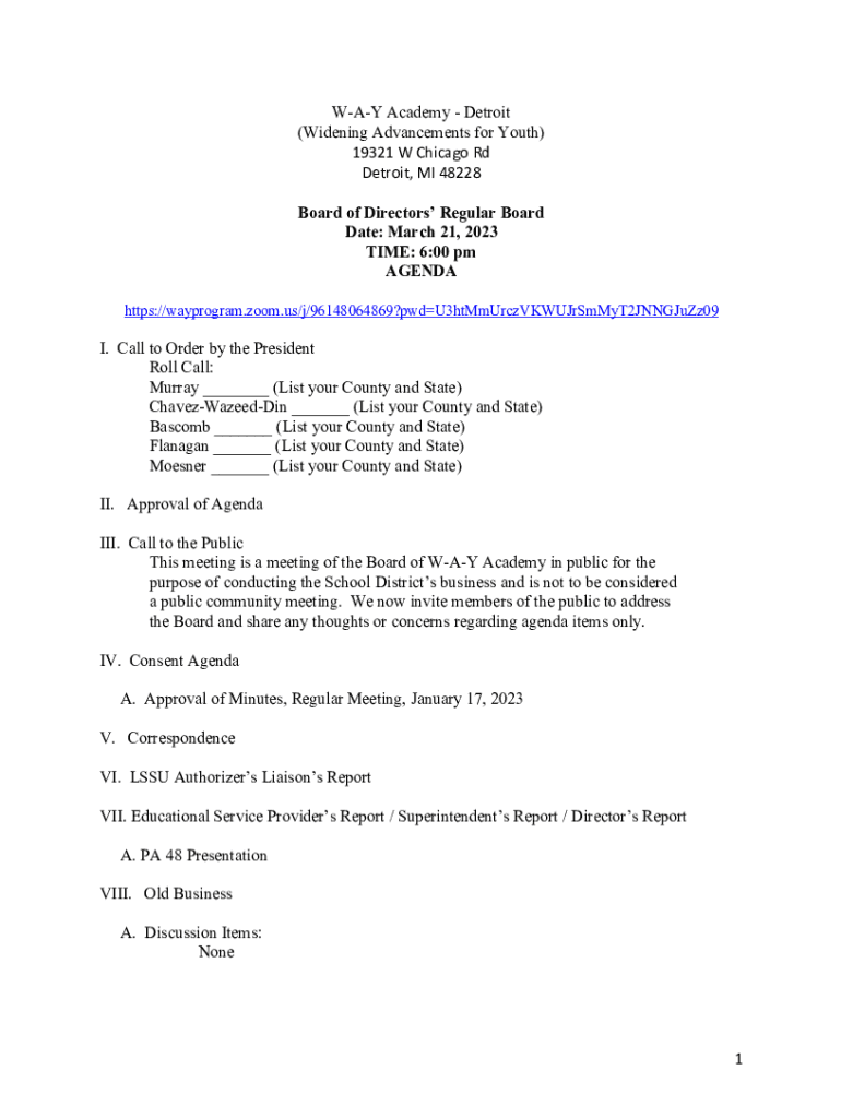 WAY Academy Detroit (Widening Advancements for Youth) 19321 W Chicago Rd Detroit, MI 48228 Board of Directors Regular Board Date: March 21, 2023, TIME: 6:00 pm AGENDA https://wayprogram.zoom.us/j/96148064869?pwdU3htMmUrczVKWUJrSmMyT2JNNGJuZz09I.