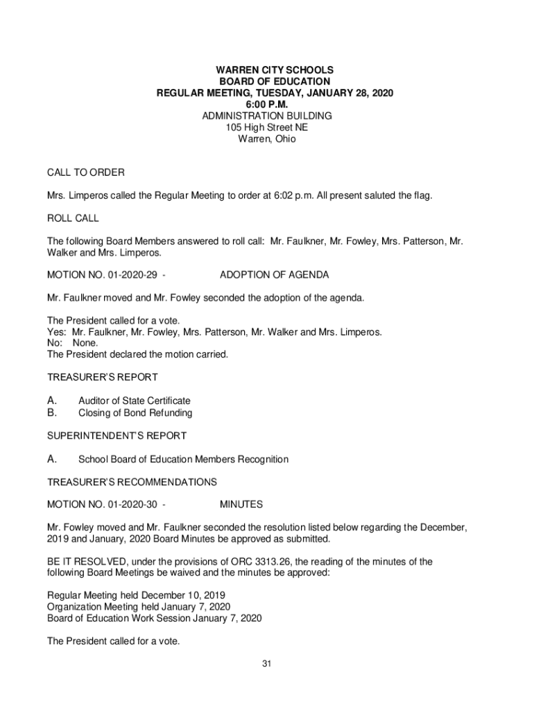 WARREN CITY SCHOOLS BOARD OF EDUCATION REGULAR MEETING, TUESDAY, JANUARY 28, 2020 6:00 P.M. ADMINISTRATION BUILDING 105 High Street NE Warren, Ohioans TO ORDER Mrs. Limpets called the Regular Meeting