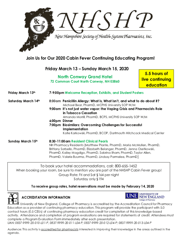 Join Us for Our 2020 Cabin Fever Continuing Educating Program! Friday, March 13 Sunday, March 15, 2020, North Conway Grand Hotel 72 Common Court North Conway, NH 038605.5 hours of live continuing