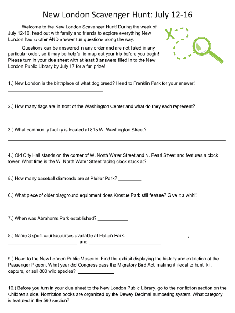 New London Scavenger Hunt: July 1216 Welcome to the New London Scavenger Hunt! During the week of July 1216, head out with family and friends to explore everything New London has to offer AND answer
