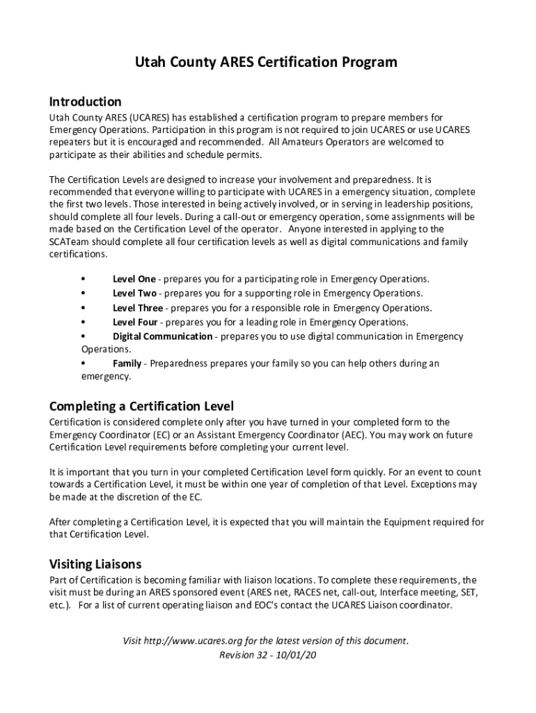 Utah County ARES Certification Program Introduction Utah County ARES (CARES) has established a certification program to prepare members for Emergency Operations. Participation in this program is not