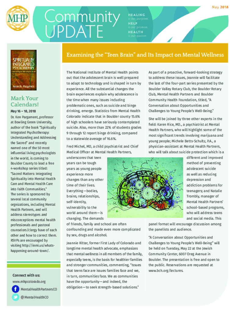 Community UPDATE May 2018 HEALING is our purpose. HELP is our promise. H E A LT H is our passionExamining the Teen Brain and Its Impact on Mental Wellness Mark Your Calendars! The National Institute