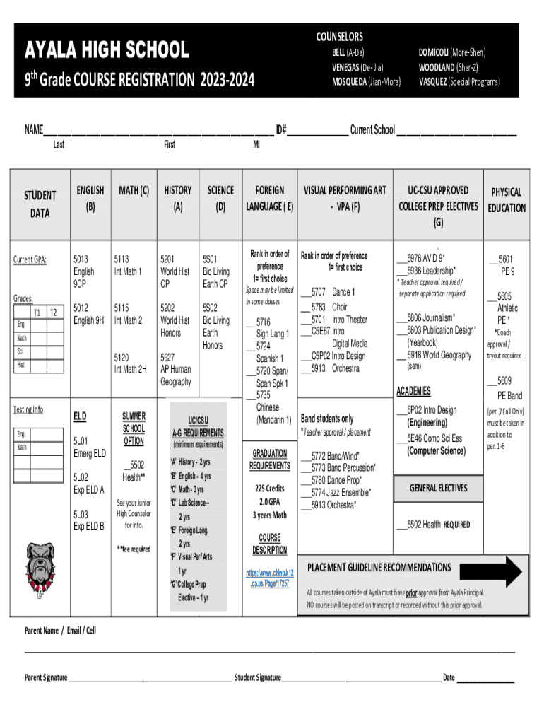 9th Grade COURSE REGISTRATION 20232024BELL (Ada)