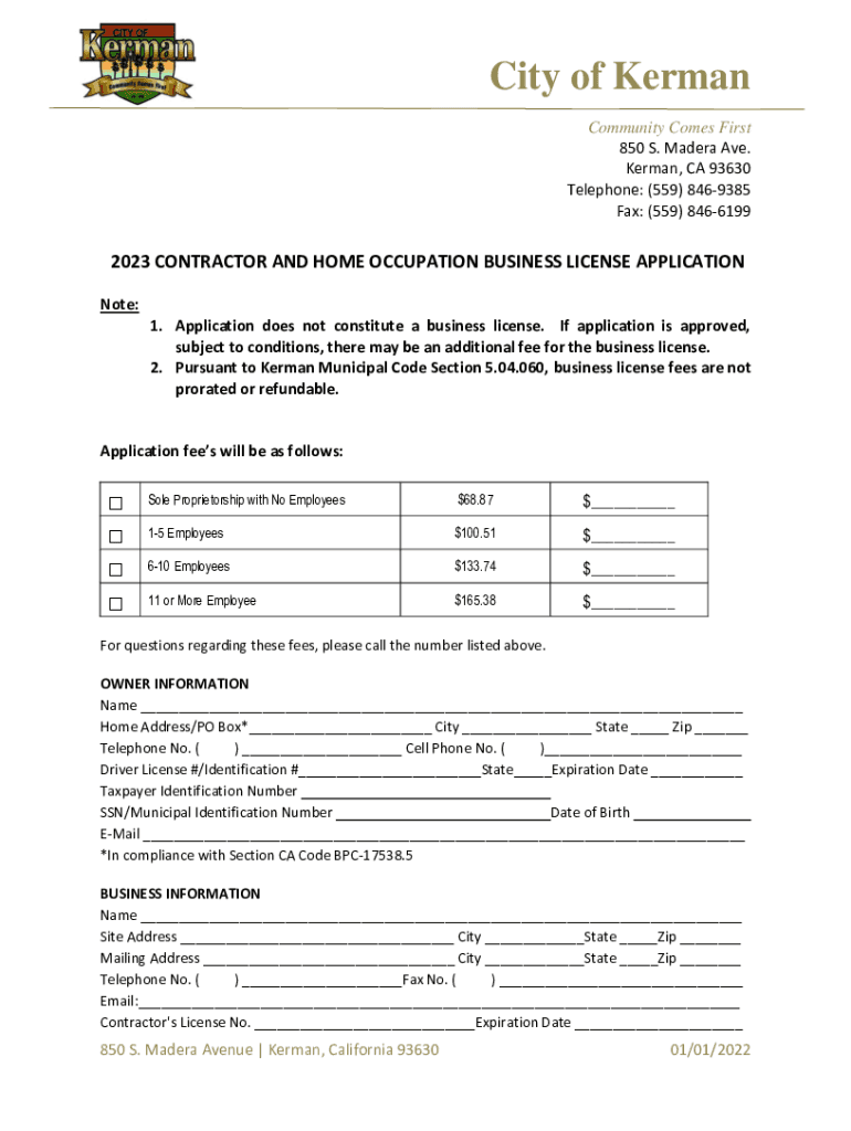 City of German Community Comes First 850 S. Madera Ave. German, CA 93630 Telephone: (559) 8469385 Fax: (559) 84661992023 CONTRACTOR AND HOME OCCUPATION BUSINESS LICENSE APPLICATION Note: 1. Application