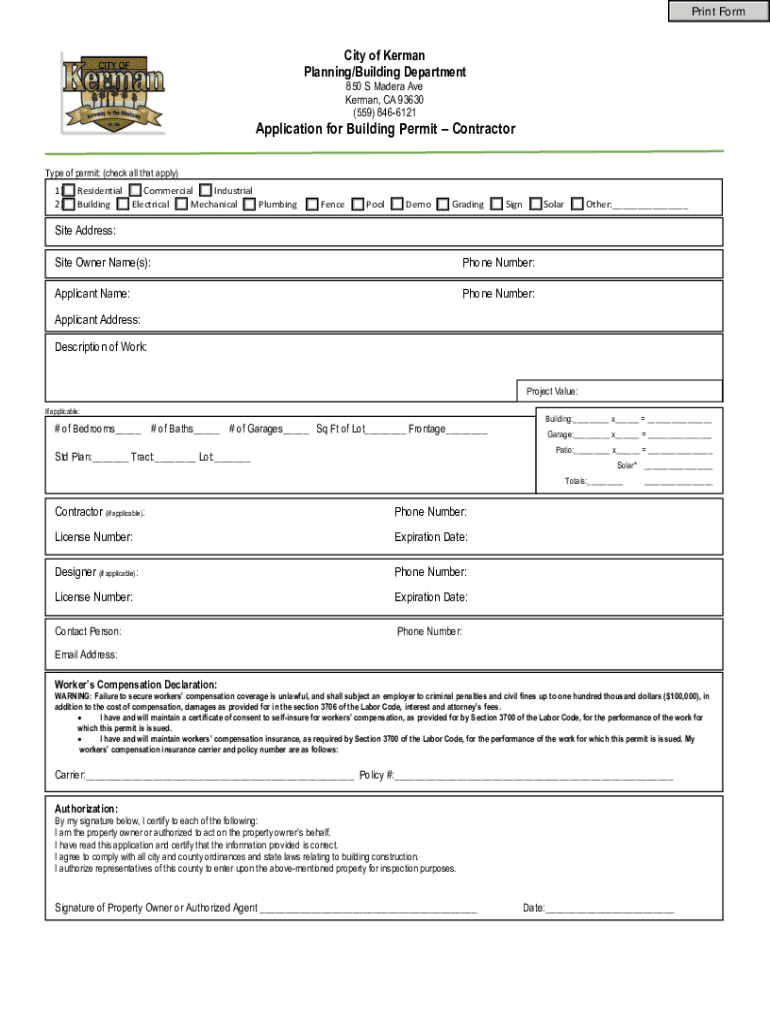Print Ferocity of German Planning/Building Department 850 S Madera Ave German, CA 93630 (559) 8466121Application for Building Permit Contractor Type of permit: (check all that apply) 1) __ Residential