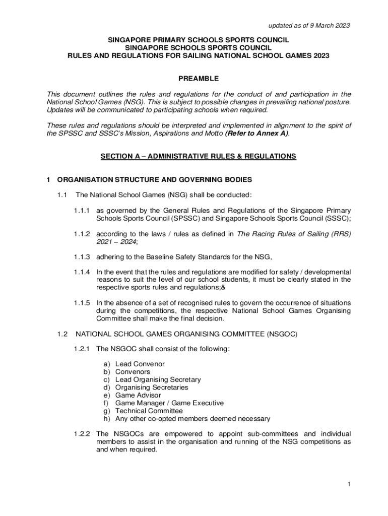 Updated as of 9 March 2023SINGAPORE PRIMARY SCHOOLS SPORTS COUNCIL SINGAPORE SCHOOLS SPORTS COUNCIL RULES AND REGULATIONS FOR SAILING NATIONAL SCHOOL GAMES 2023PREAMBLE This document outlines the