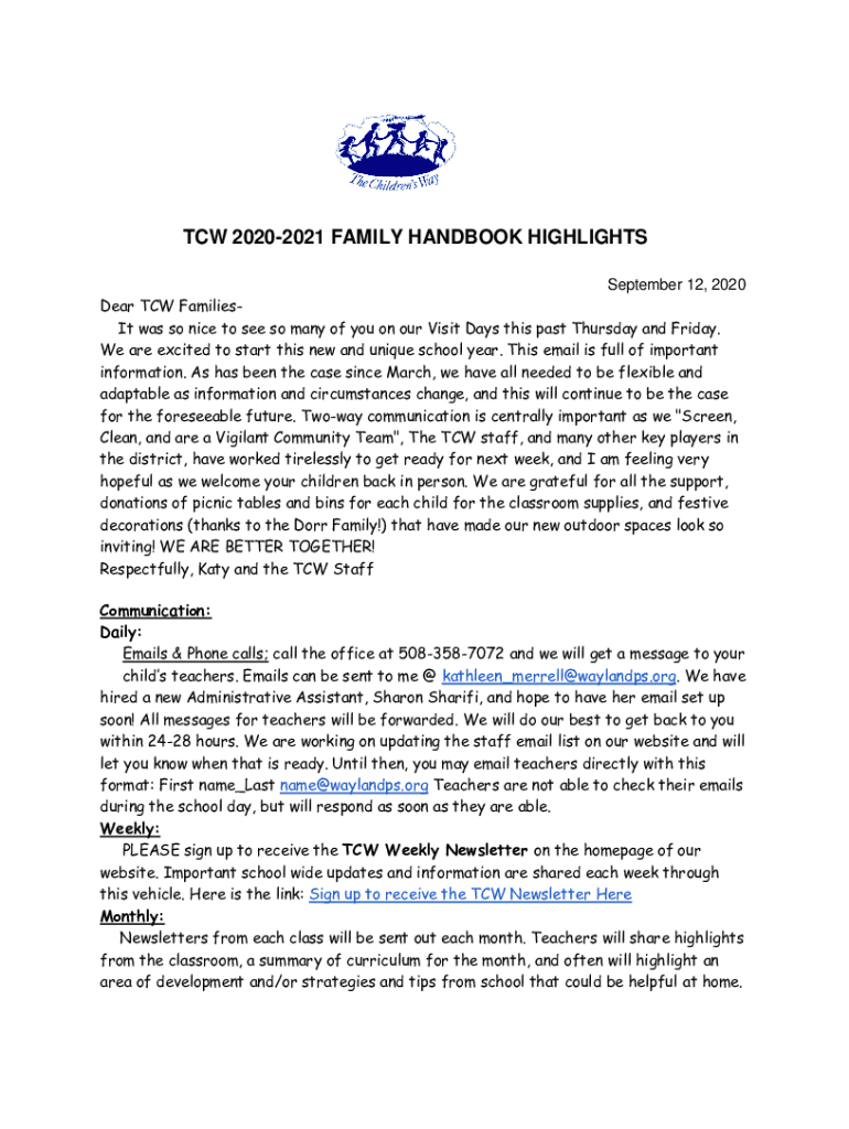 TCW 20202021 FAMILY HANDBOOK HIGHLIGHTS September 12, 2020, Dear TCW Families It was so nice to see so many of you on our Visit Days this past Thursday and Friday. We are excited to start this new