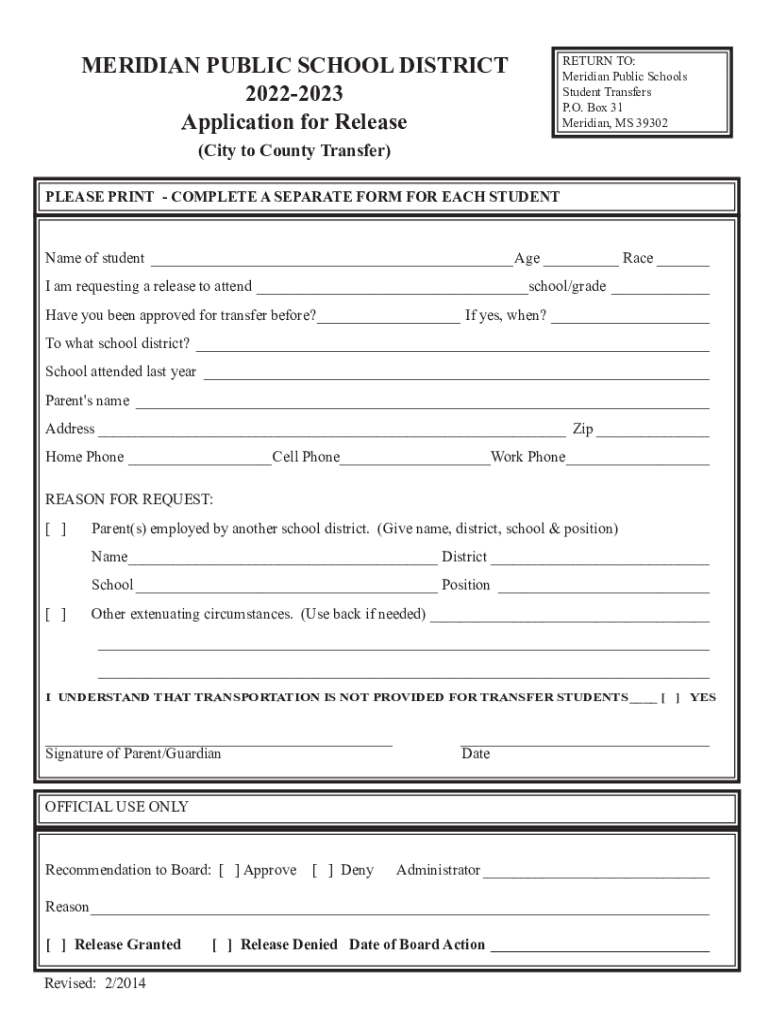MERIDIAN PUBLIC SCHOOL DISTRICT 20222023 Application for ReleaseRETURN TO: Meridian Public Schools Student Transfers P.O. Box 31 Meridian, MS 39302(City to County Transfer) PLEASE PRINT COMPLETE A