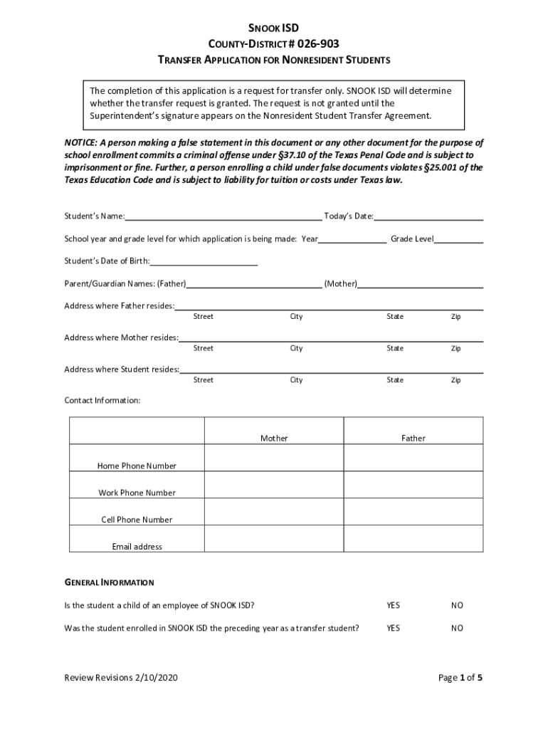 SHOOK ISD COUNTYDISTRICT # 026903 TRANSFER APPLICATION FOR NONRESIDENT STUDENTS The completion of this application is a request for transfer only. SHOOK ISD will determine whether the transfer request
