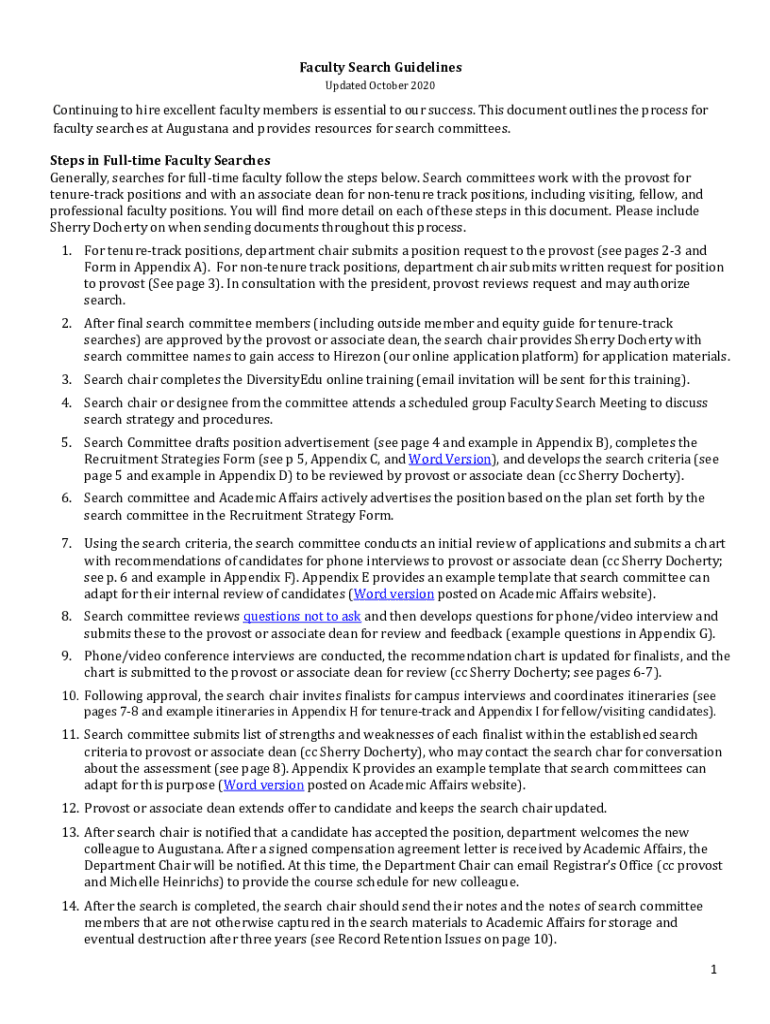 Faculty Search Guidelines Updated October 2020Continuing to hire excellent faculty members is essential to our success. This document outlines the process for faculty searches at Augustan and provides