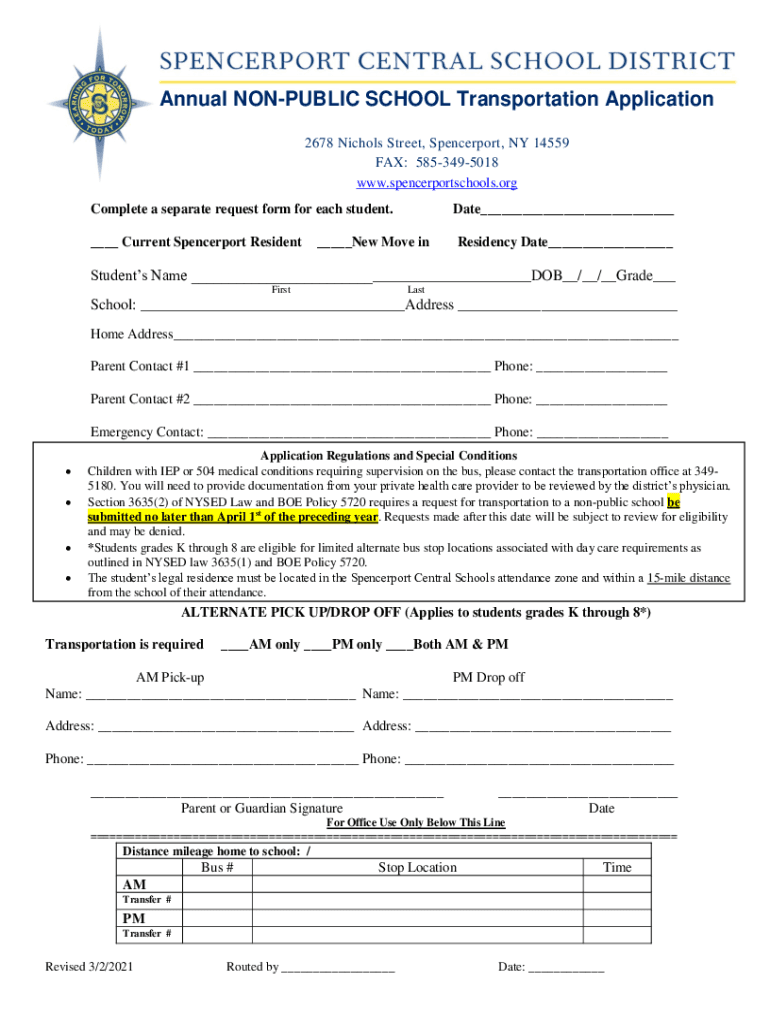 Annual NONPUBLIC SCHOOL Transportation Application 2678 Nichols Street, Spencer port, NY 14559 FAX: 5853495018 www.spencerportschools.org Complete a separate request form for each student. ___ Current