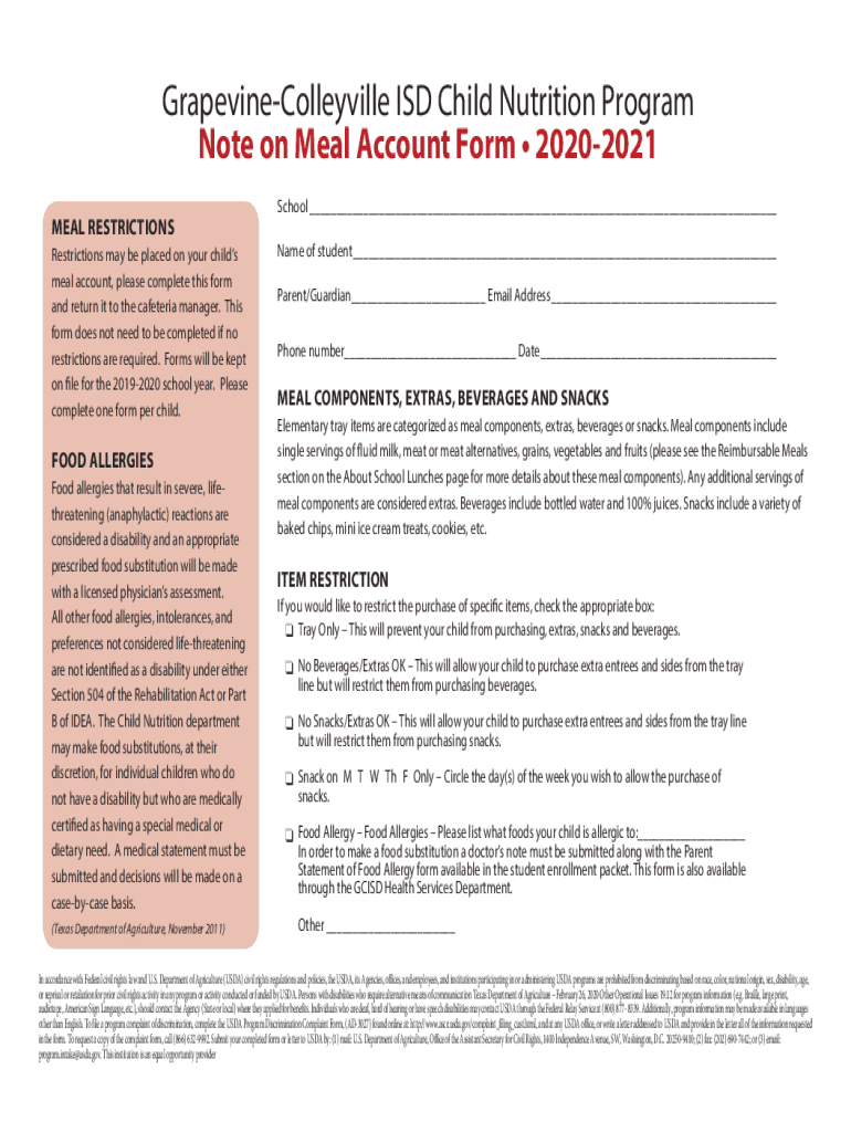 GrapevineColleyville ISD Child Nutrition Program Note on Meal Account Form 20202021 MEAL RESTRICTIONS may be placed on your children meal account, please complete this form and return it to the cafeteria