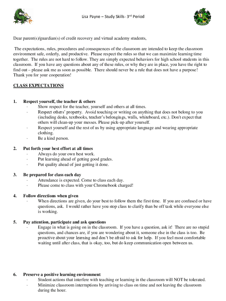 Lisa Payne Study Skills 3rd Periodic parent(s)/guardian(s) of credit recovery and virtual academy students, The expectations, rules, procedures and consequences of the classroom are intended to keep
