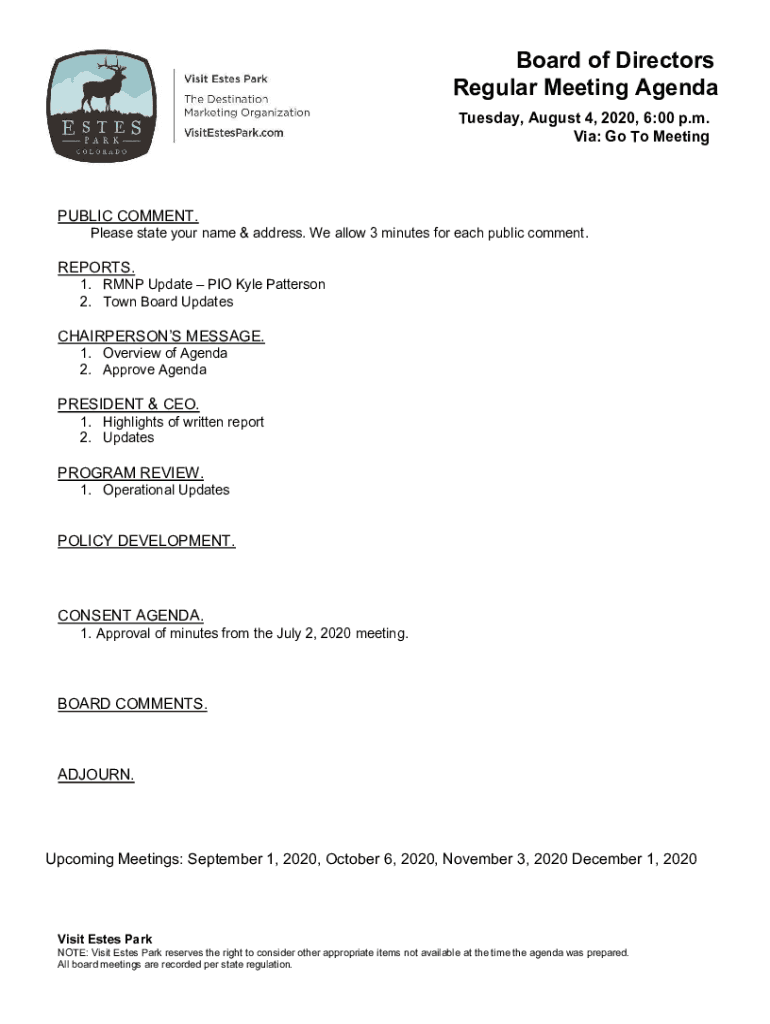 Board of Directors Regular Meeting Agenda Tuesday, August 4, 2020, 6:00 p.m. Via: Go To MeetingPUBLIC COMMENT. Please state your name & address. We allow 3 minutes for each public comment.REPORTS.1.