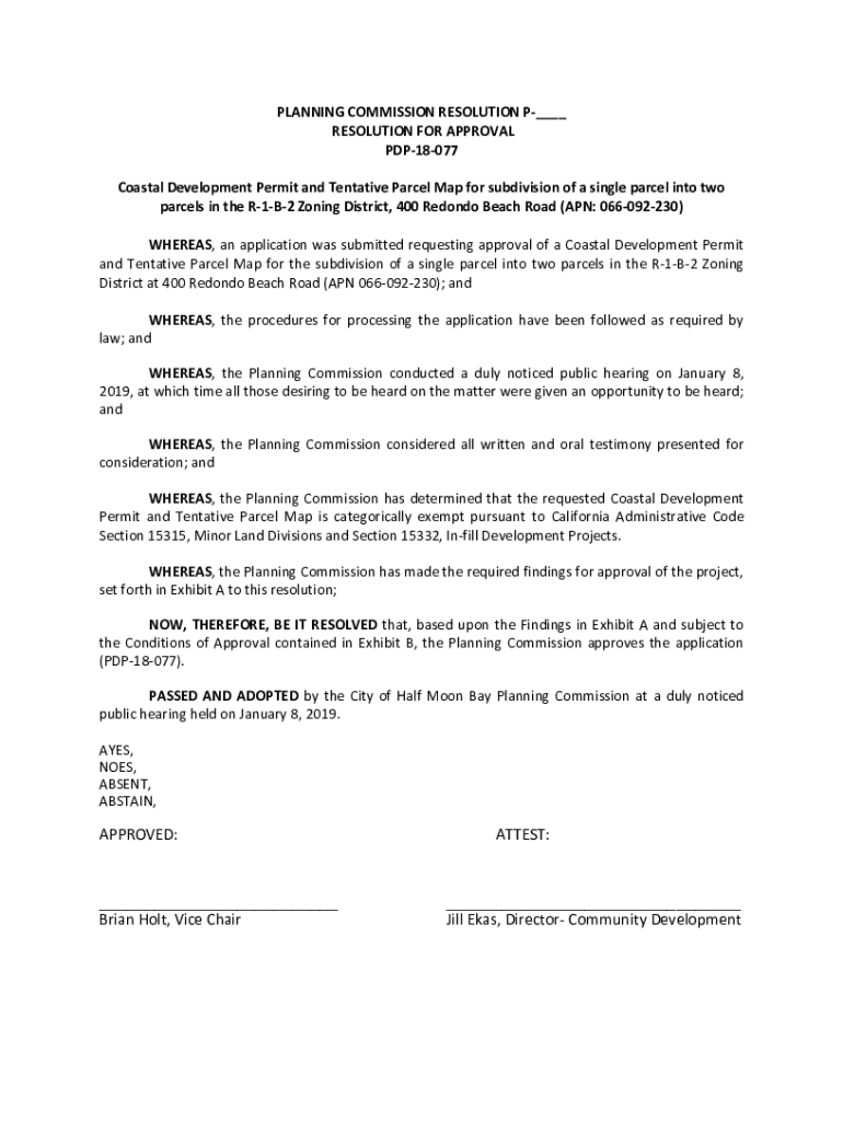 PLANNING COMMISSION RESOLUTION P___ RESOLUTION FOR APPROVAL PDP18077 Coastal Development Permit and Tentative Parcel Map for subdivision of a single parcel into two parcels in the R1B2 Zoning District,