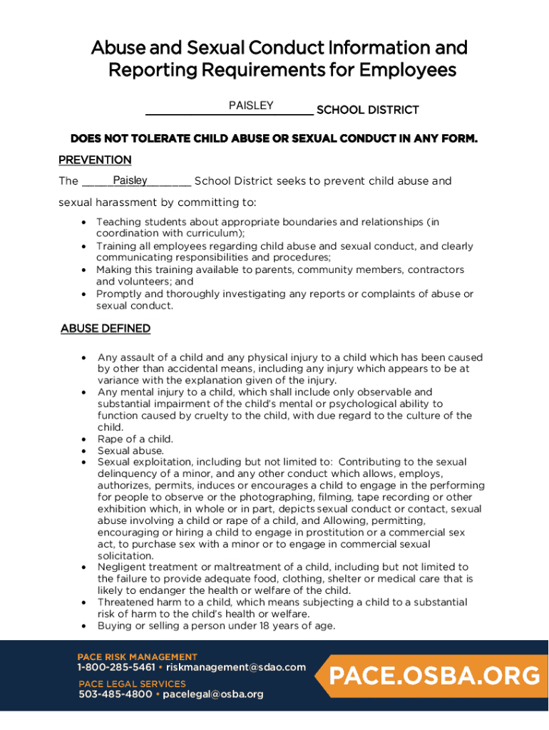 Abuse and Sexual Conduct Information and Reporting Requirements for Employees PAISLEY ___ SCHOOL DISTRICT DOES NOT TOLERATE CHILD ABUSE OR SEXUAL CONDUCT IN ANY FORM. PREVENTIONPaisley The ___ School