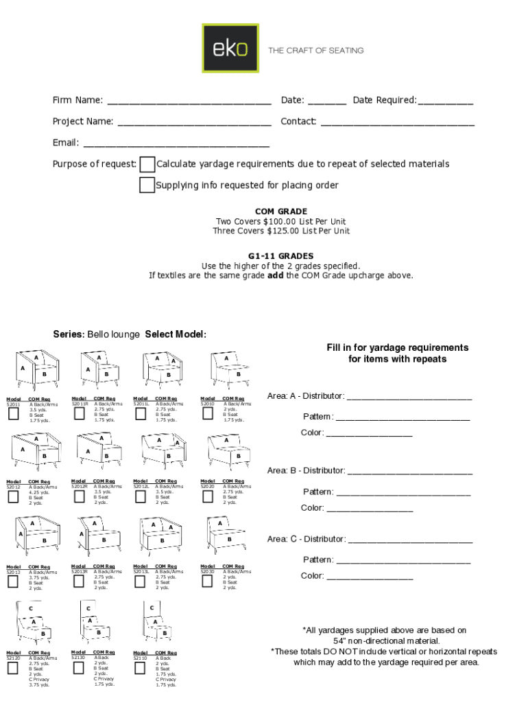 Firm Name: ___Date: ___ Date Required:___Project Name: ___Contact: ___Email: ___ Purpose of request:Calculate yardage requirements due to repeat of selected materials Supplying info requested for