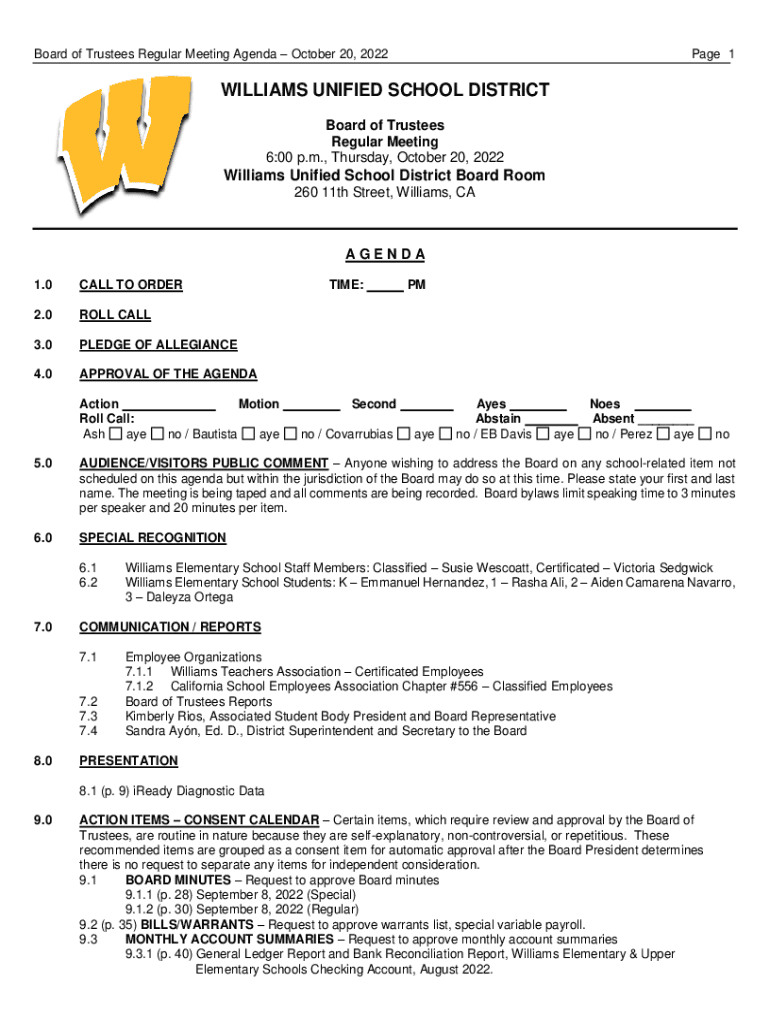 Board of Trustees Regular Meeting Agenda October 20, 2022Page 1WILLIAMS UNIFIED SCHOOL DISTRICT Board of Trustees Regular Meeting 6:00 p.m., Thursday, October 20, 2022Williams Unified School District