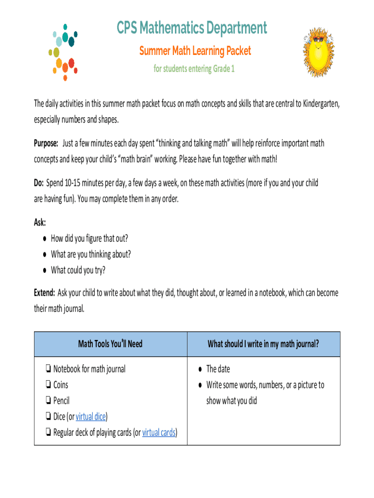 CPS Mathematics Department Summer Math Learning Packet for students entering Grade 1The daily activities in this summer math packet focus on math concepts and skills that are central to Kindergarten,