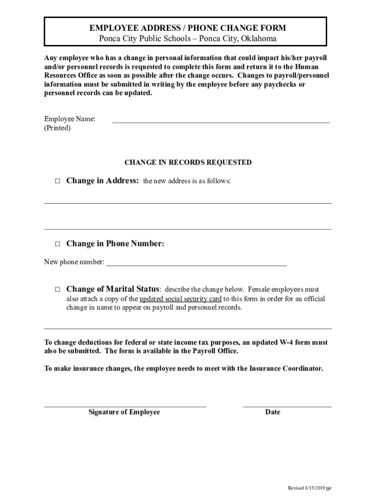 EMPLOYEE ADDRESS / PHONE CHANGE FORM Ponca City Public Schools Ponca City, Oklahoma Any employee who has a change in personal information that could impact his/her payroll and/or personnel records
