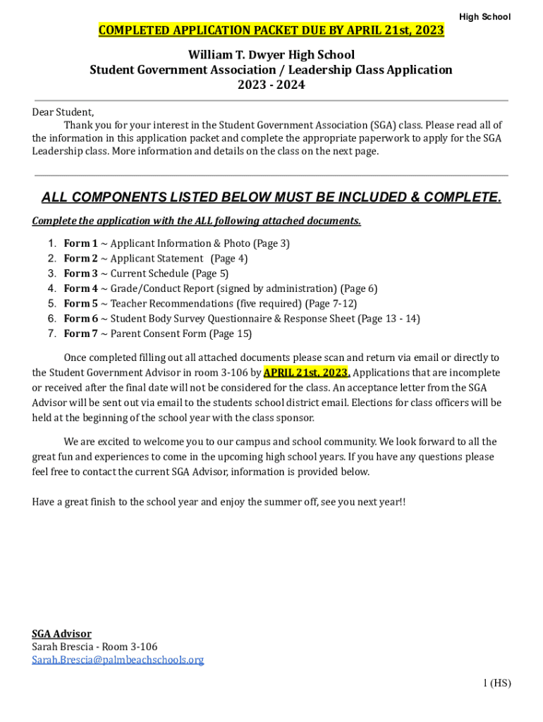 High SchoolCOMPLETED APPLICATION PACKET DUE BY APRIL 21st, 2023 William T. Dwyer High School Student Government Association / Leadership Class Application 2023 2024 Dear Student, Thank you for your