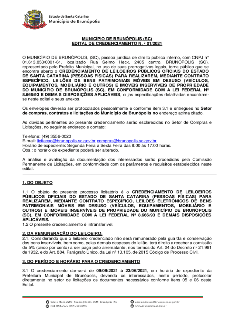 MUNICIPAL DE BEANPOLES (SC) EDIT AL DE CREDENCIAMENTO N. 01/2021O MUNICIPAL DE BEANPOLES, (SC), person juridical DE direct public intern, com CNJ n 01.613.853/000161, localized RUA Selma Heck, 2405