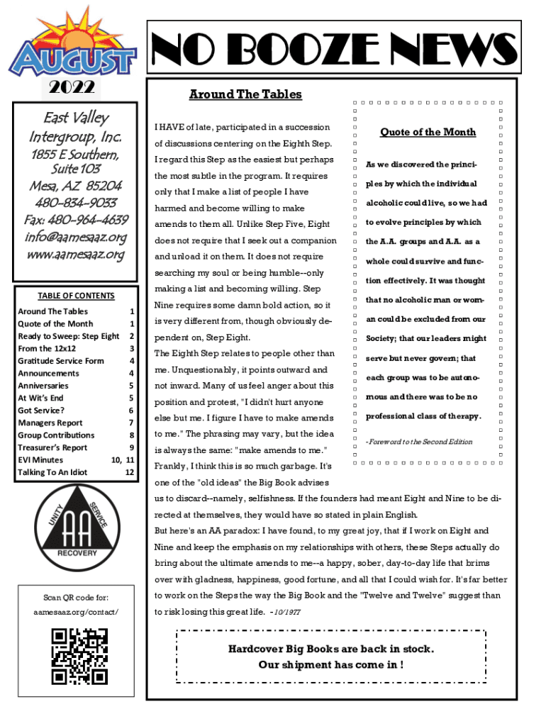 NO BOOZE NEWS 2022Around The Tables East Valley Intergroup, Inc. I HAVE of late, participated in a succession1855 E Southern, Suite 103 Mesa, AZ 85204 4808349033 Fax: 4809644639 info@aamesaaz.org