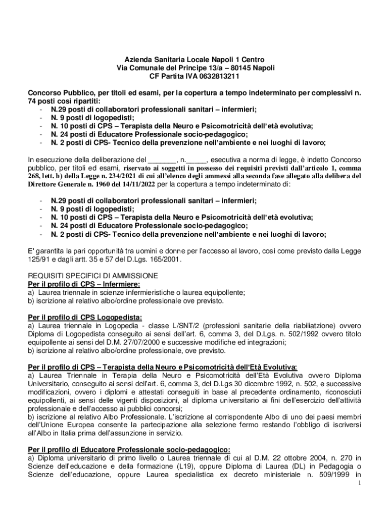 Agenda Sanitarian Locale Naomi 1 CENTR Via Communal Del Principe 13/a 80145 Naomi CF Parties IVA 0632813211 Concerto Public, per title ed Sami, per la aperture a tempo indeterminate per compressive