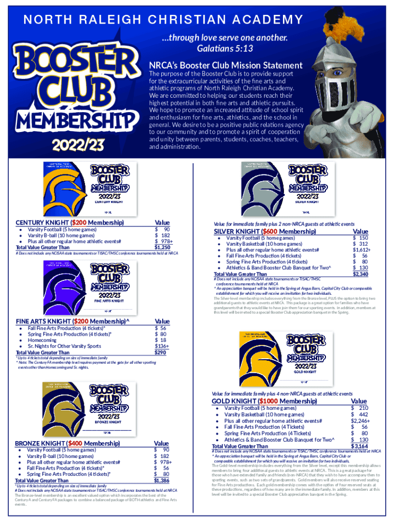 NORTH RALEIGH CHRISTIAN ACADEMY through love serve one another. Galatians 5:13BOOLSTER UP c MEMBERSHIPNRCAs Booster Club Mission Statement purpose of the Booster Club is to provide support for the