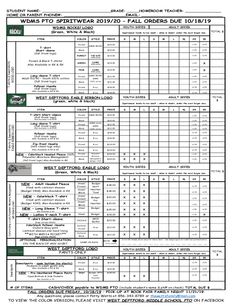 STUDENT NAME: ___GRADE: ___HOMEROOM TEACHER: ___ HOME OR PARENT PHONE#: ___EMAIL: ___DMS PTO SPIRITUAL 2019/20 FALL ORDERS DUE 10/18/19 YOUTH SIZESWDMS ROCKS! LOGO (Green, White & Black) ITEMCOLORTshirts