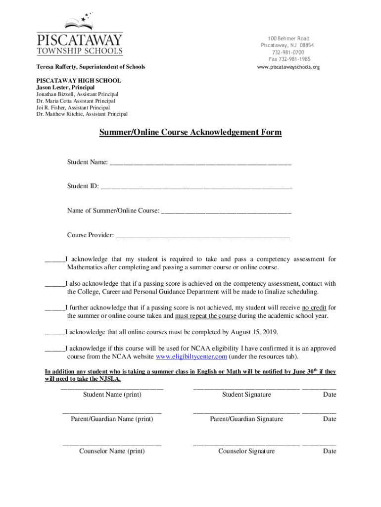 Get the free Summer/Online Course Acknowledgement Form