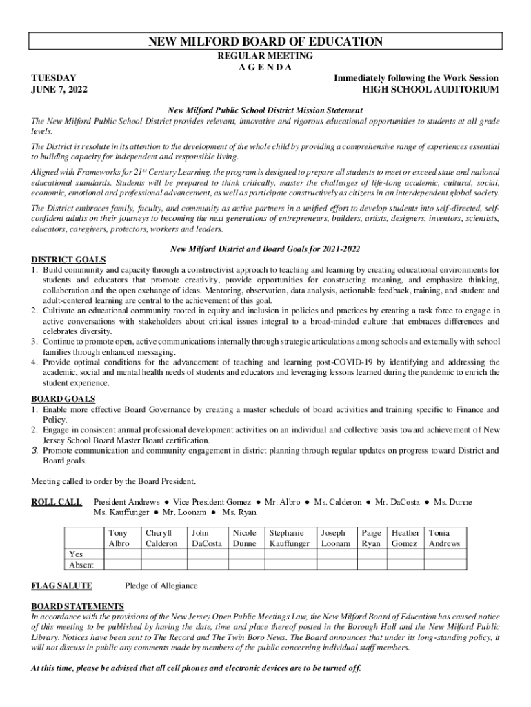 NEW MILFORD BOARD OF EDUCATION REGULAR MEETING AGENDA TUESDAY, JUNE 7, 2022Immediately following the Work Session HIGH SCHOOL Auditorium Milford Public School District Mission Statement The New Milford