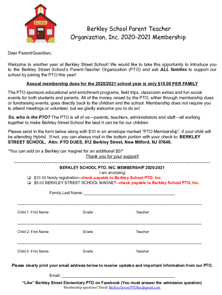 Berkley School Parent Teacher Organization, Inc. 20202021 Membership Dear Parent/Guardian, Welcome to another year at Berkley Street School! We would like to take this opportunity to introduce you