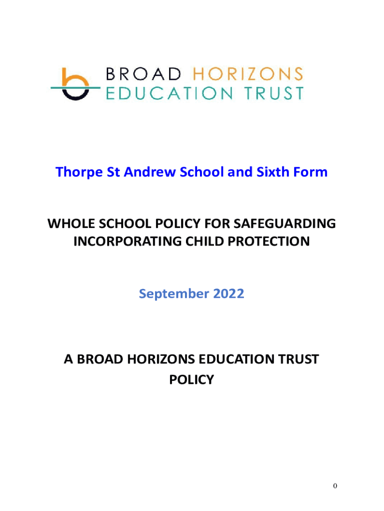 Thorpe St Andrew School and Sixth Form WHOLE SCHOOL POLICY FOR SAFEGUARDING INCORPORATING CHILD PROTECTION September 2022A BROAD HORIZONS EDUCATION TRUST POLICY0Keeping Children Safe in Education,