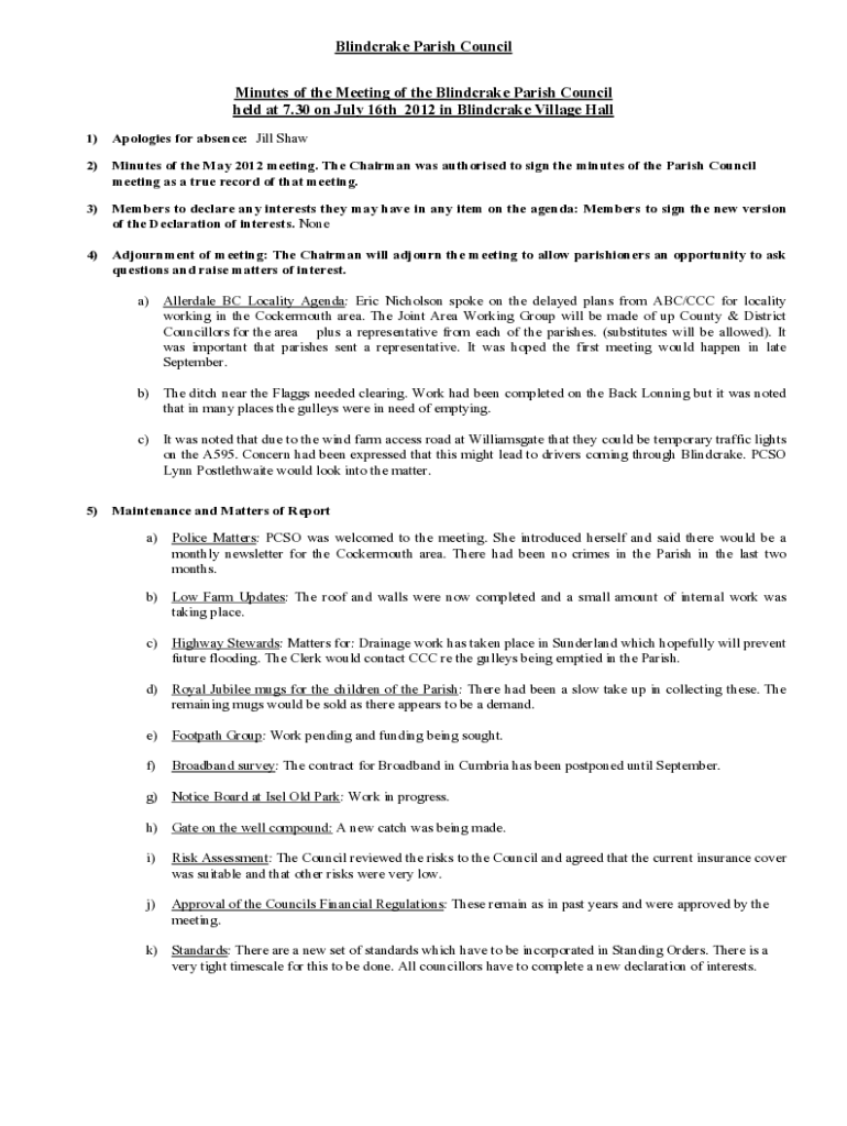 Blindcrake Parish Council Minutes of the Meeting of the Blindcrake Parish Council held at 7.30 on July 16th 2012 in Blindcrake Village Hall 1) Apologies for absence: Jill Shaw 2) Minutes of the May